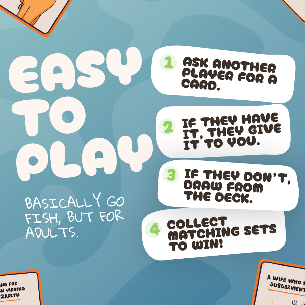 classic card game. Go fishing for the embarrassing cards your friends hold in their hand and go fuck yourself if you guess wrong!